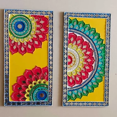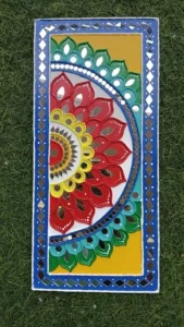 - Our big rectangular colorful Lippan art is a stunning blend of vibrant shades and traditional craftsmanship. The bold rectangular frame gives it a strong and elegant presence, while the handcrafted clay patterns add rich texture and artistic depth. The mix of lively colors makes the design feel joyful yet refined,Carefully placed mirror work enhances the beauty by reflecting light and creating a soft sparkle across the surface. This beautiful combination of color, texture, and shine turns the artwork into a true statement piece. Perfect for large walls and spacious interiors, it adds character, warmth, and timeless cultural charm to your home.