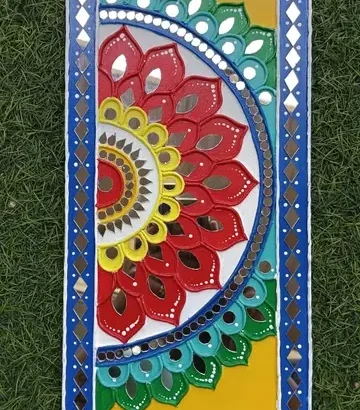- Delicate mirror accents are carefully placed throughout the design, reflecting light and adding depth and sparkle. The balance of color, texture, and shine gives the artwork a lively yet classy look. Perfect for spacious walls, living rooms, or statement areas, this big Lippan art piece brings energy, culture, and timeless elegance into your home.