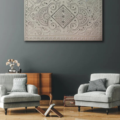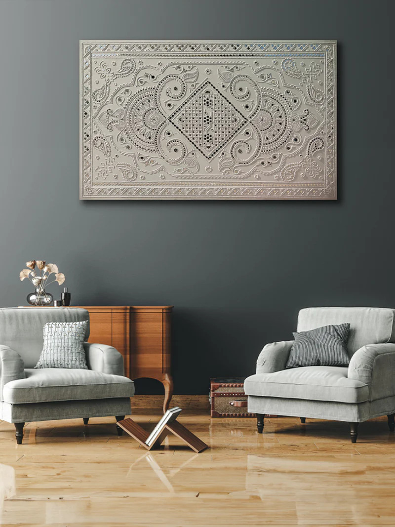 - Subtle mirror accents reflect light softly, adding depth and dimension while preserving its understated sophistication. Rooted in age-old craftsmanship, this artwork embodies purity, balance, and cultural richness. Designed to command attention with quiet luxury, it transforms expansive walls into a canvas of tradition, elegance, and enduring beauty.